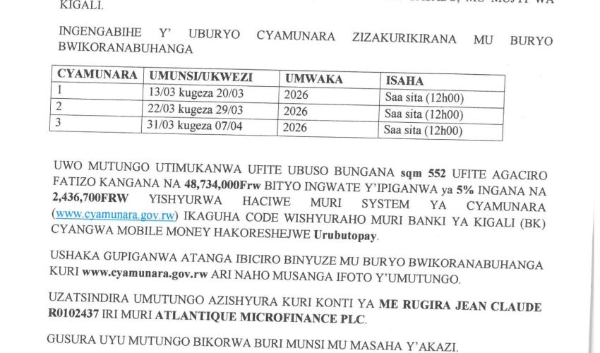 UWO MUTUNGO UTIMUKANWA UFITE UBUSO BUNGANA sqm 552 UFITE AGACIRO FATIZO KANGANA NA 48,734,000FW BITYO INGWATE YIPIGANWA ya 5% INGANA NA 2,436,700FRW YISHYURWA HACIWE MURI SYSTEM YA CYAMUNARA (www.cyamunara.gov.rw) IKAGUHA CODE WISHYURAHO MURI BANKI YA KIGALI (BK) CYANGWA MOBILE MONEY HAKORESHEJWE Urabatopay.